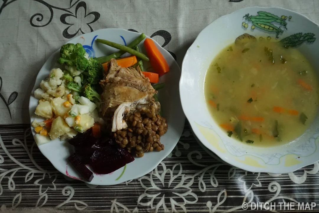 Lunch was even better than breakfast: vegetable soup, lentils, rice, broccoli, cauliflower, carrots, peas, grilled chicken, beets, and potato salad.