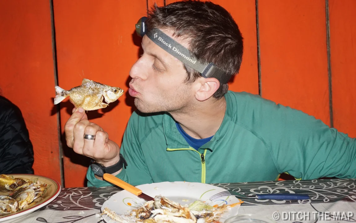 Scott eating a piranha he caught in the rivers of The Pampas, Bolivia