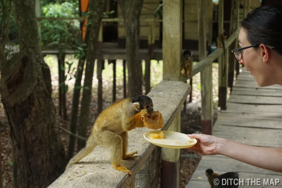Sylvie gets enjoyment out of feeding the monkeys her leftovers in The Pampas, Bolivia
