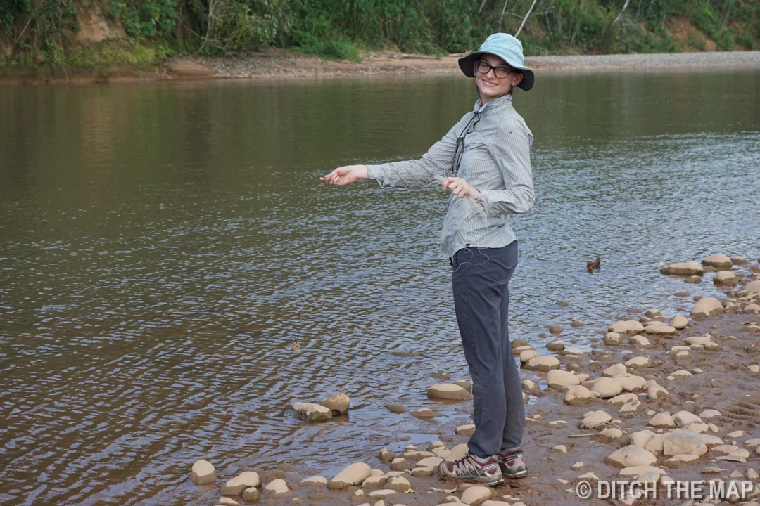 Sylvie fishes in the river during our trip to the Amazonian Jungle, Bolivia