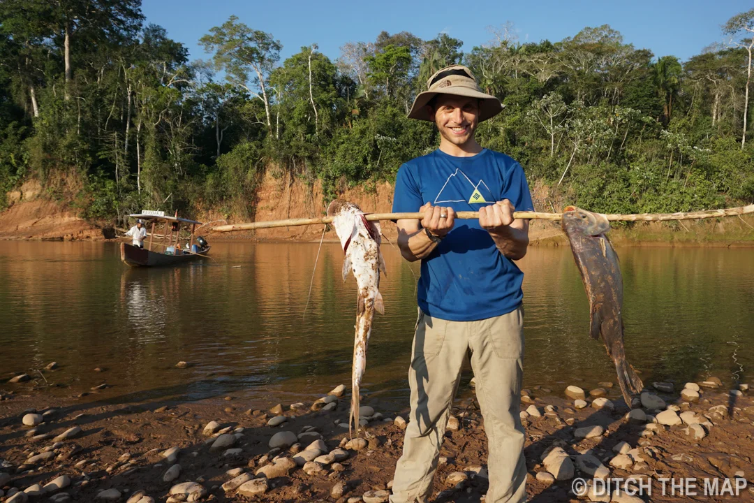 Scott holds our group's catch along the RIVER DURING OUR TRIP TO THE AMAZONIAN JUNGLE, BOLIVIA