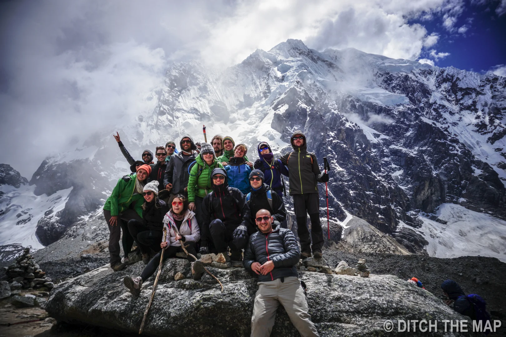 OUR GROUP POSES ABOVE 15K FEET AT THE SALKANTAY MOUNTAIN PASS, PERU