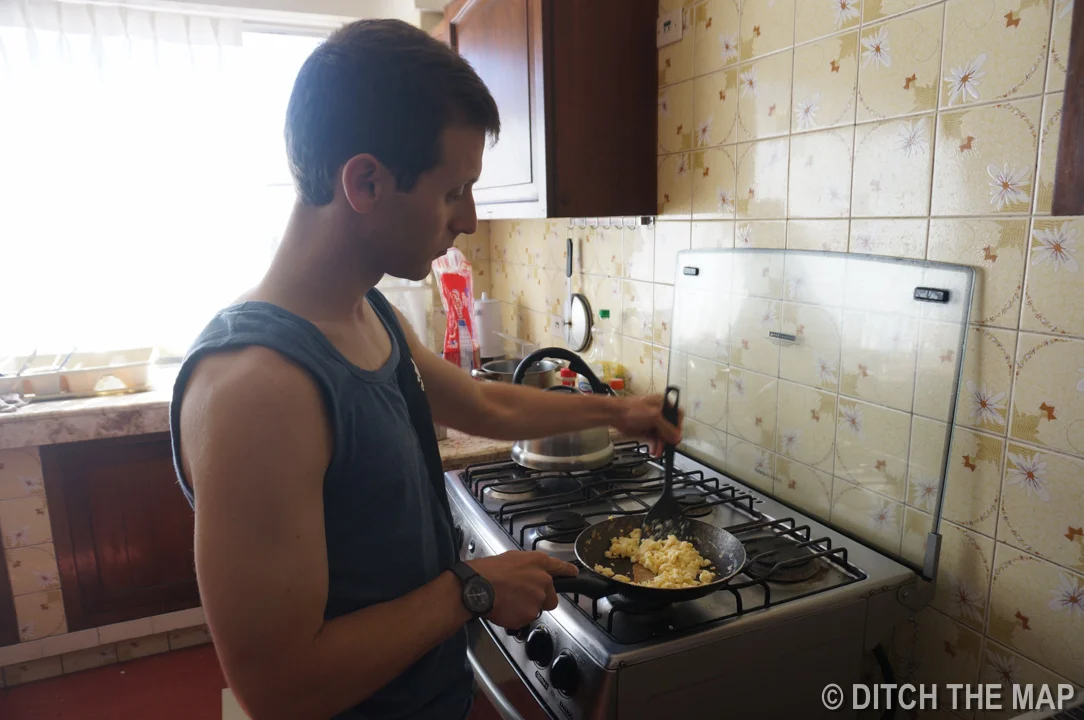 I cook breakfast for Sylvie in our hotel in La Paz, Bolivia