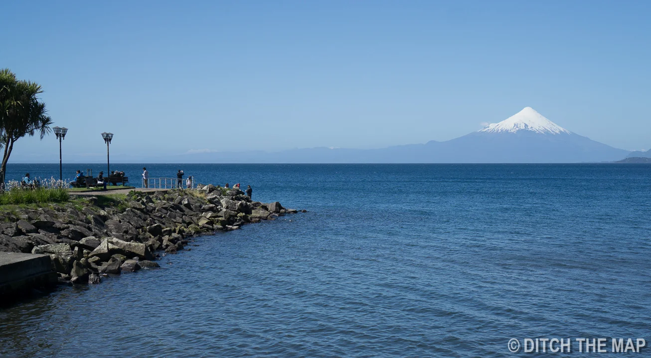 A view of the lake and a volcano from the city of Puerto Varas, Chile