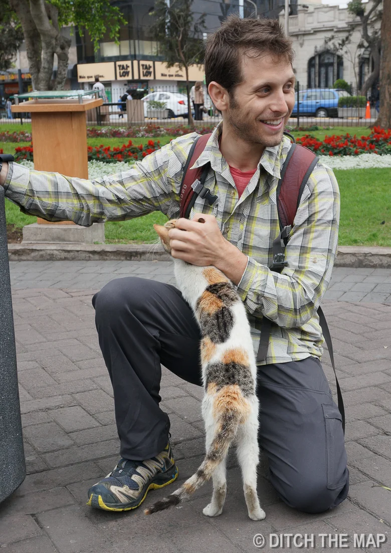 We walked to Parque Central and Kennedy Park—well maintained parks in the center of the Mira Flores district. The parks had dozens, if not hundreds of cats all over. Cats were in trees, in the flowers, on benches, in the middle of the sidewalks. These cats were so friendly they would come up to people and plot down right in their laps. We saw a few people sitting in the park reading the paper petting a couple cats that had sat on their laps.