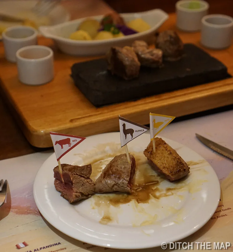 For dinner that night, Scott did some research and founded the highest rated restaurant in Arequipa. Most importantly, this restaurant, Zig Zag, offered Alpaca steak—a delicacy Scott has been searching for since we've been in Peru. We split a bottle of wine (and definely felt is heightened effects with the altitude), a cheese plate, a salad, a meat plate with steak, alpaca, duck and potatoes, and two desserts chocolate mouse and an apple tart. I took enjoyment in being served in the style of a fancy restaurant sampling the wine before being poured a glass, bread to start the meal with butter and a pesto dipping sauce, oil and vinegar on the table the little things. It was nice to be spoiled for a night.