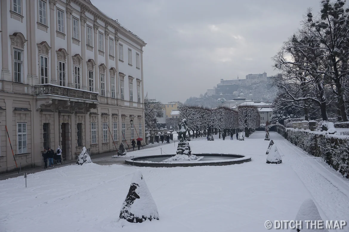 It was snowing when we headed out the following morning. We bundled up and walked across the river to the old part of town. Our hostel is in the new part of town, most of which was rebuilt after WWII. We passed by the Mirabel Palace and followed our view of the old Hohensalzburg fortress on top of the hill to lead us in the right direction.