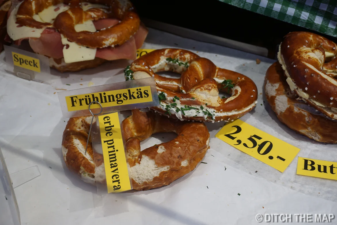 As we walked around the town we passed through a small outdoor market with different stands selling fresh produce, pretzels, breads and sausages. We admired all of the curious treats at the bread stand- apple strudels, pretzels filled with all sorts of sweet and savory fillings, and breads loaded with nuts, seeds and dried fruits. We sampled some of the breads and bought one that tasted more like an oatmeal raisin cookie than bread. We have noticed that the breads here are very dense! We also bought a huge soft pretzel stuffed with chive and garlic cream cheese. Cream cheese and spreads for bread are huge here! In fact, in the grocery store we saw more variety of Philadelphia cream cheese than we have ever seen at home.