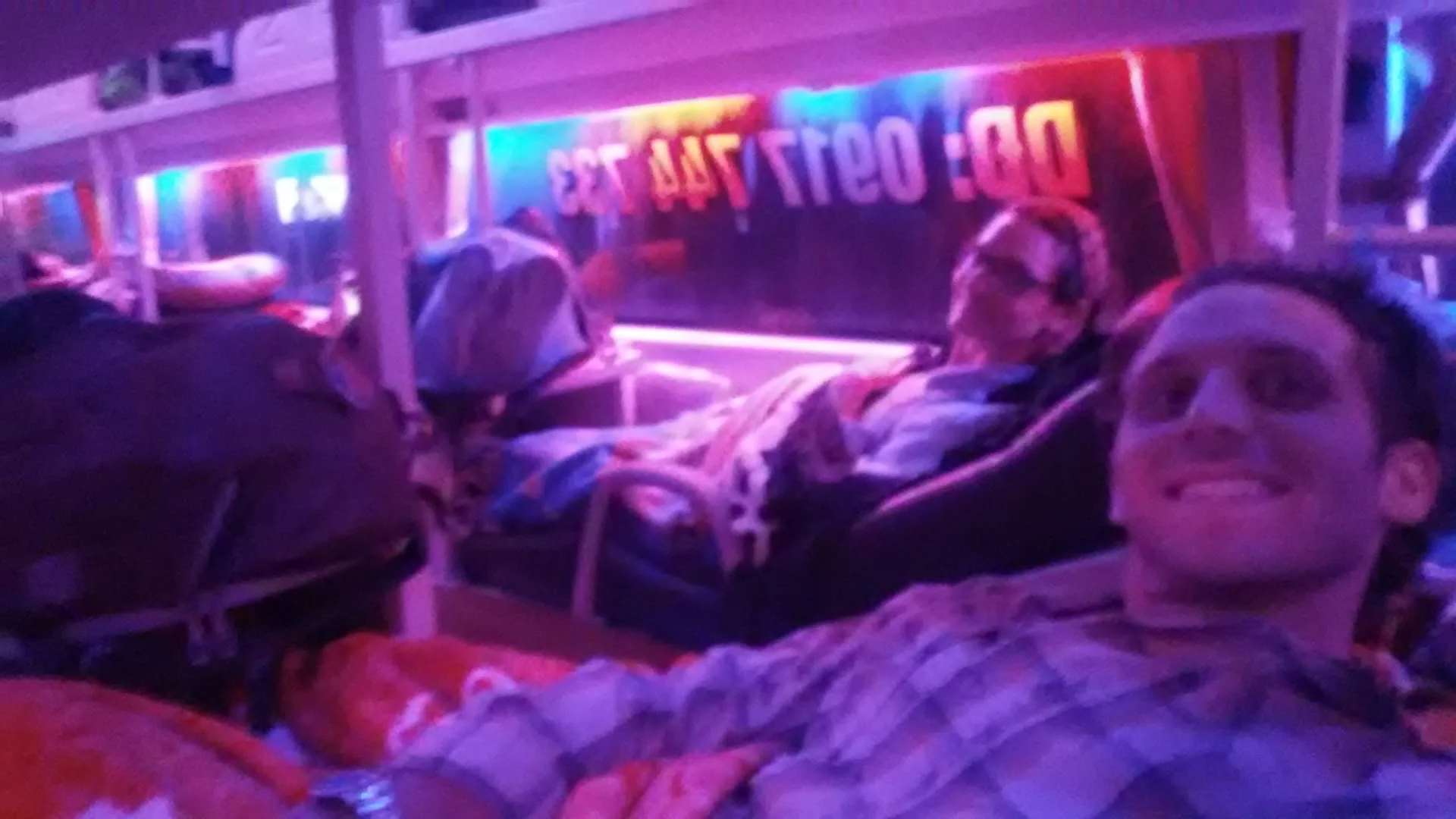 We try to get comfortable on our sleeper bus from ha giang provence to hanoi, vietnam