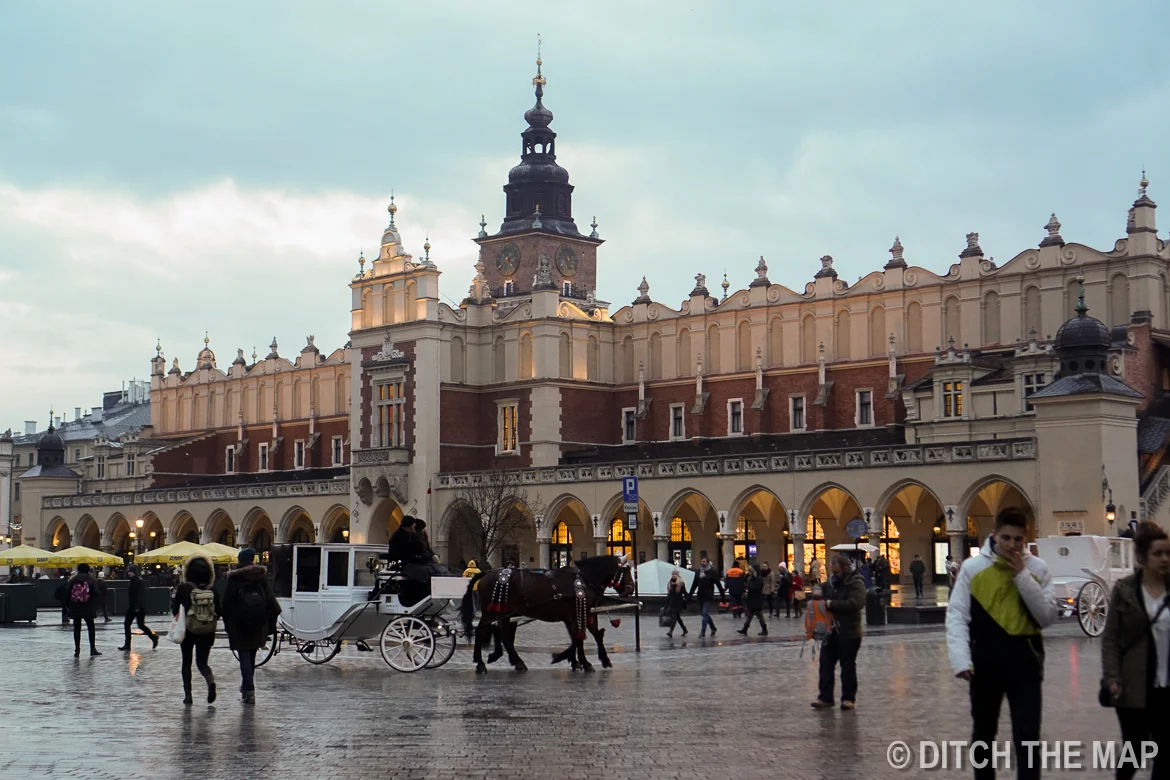 Our hostel is situated between the Jewish section and Old Town. The snow had turned to rain but we were determined to walk around the area. The Jewish section encompasses an area of 4 blocks by 4 blocks. During the German invasion of Krakow this was the Ghetto in which the Jews were forced to live. There were a handful of synagogues, though they were rather small and we walked past several of them without knowing it. There was one particular street with many Jewish restaurants. On the other side of the Jewish section there was a square, Plac Nowy, which served food outside of windows. There were multiple stands and a few people buying food there. At $1-$2 for a wrap or entire pizza it was hard to pass up. There were even a few hostels pubs, and casual dining areas around the square. We decided on a place to eat and enjoyed a nice candlelit dinner with live music in the background. Sylvie and I got matzo served along 3 dipping sides, an Israeli salad, and Cholet—a Jewish stew comprising of 3 types of beans and beef. I enjoyed a nice unfiltered beer while Sylvie sipped on hot mead.