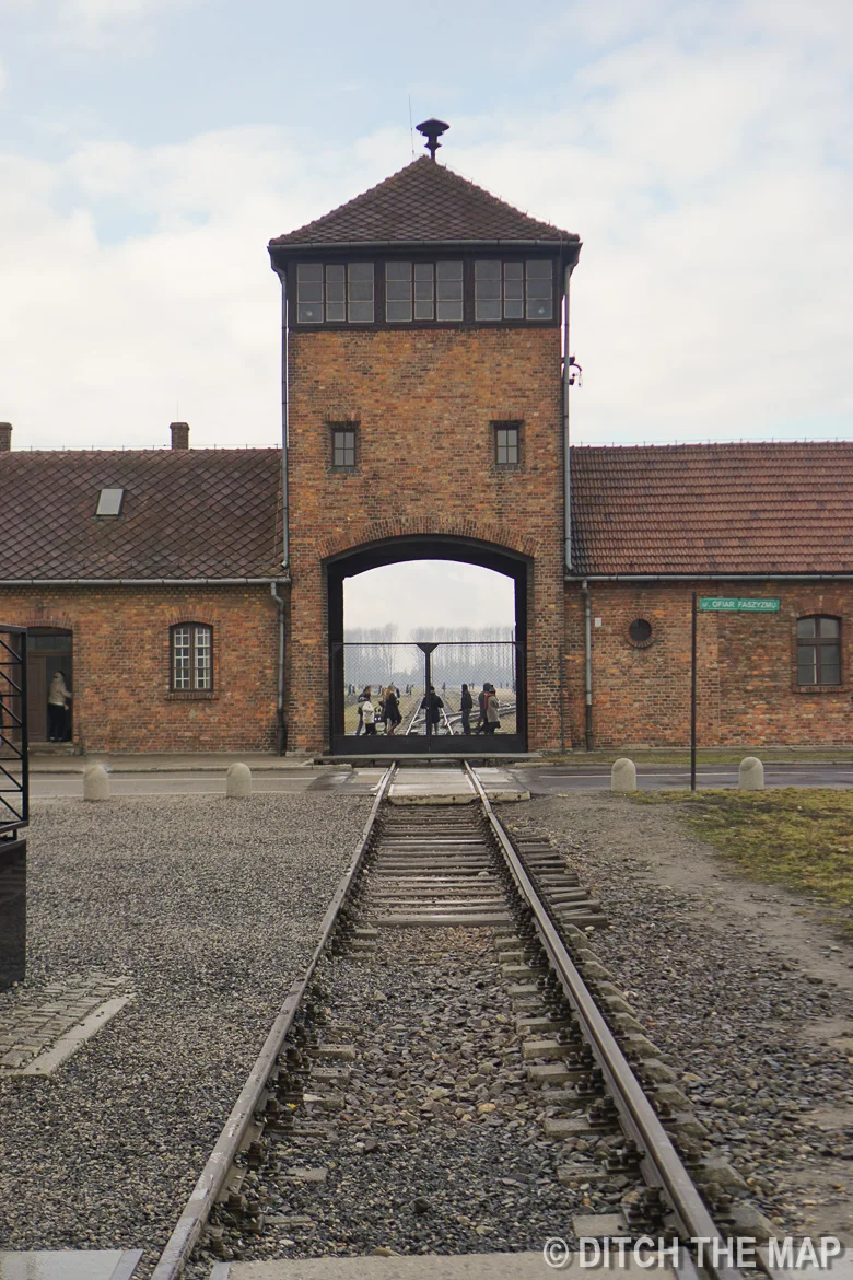 Train tracks leading right into the front gates of Auschwitz II, Poland