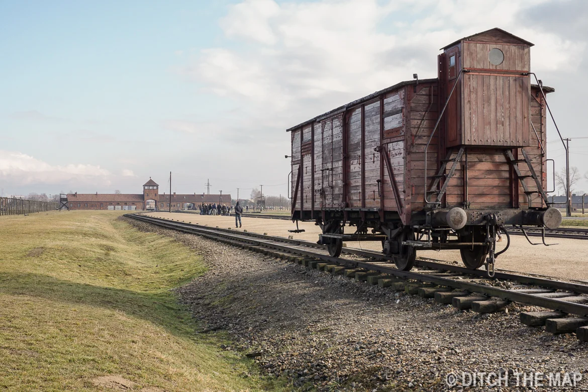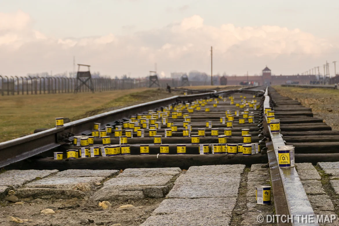 The train tracks terminate inside the camp at the crematoria in Auschwitz II, Poland