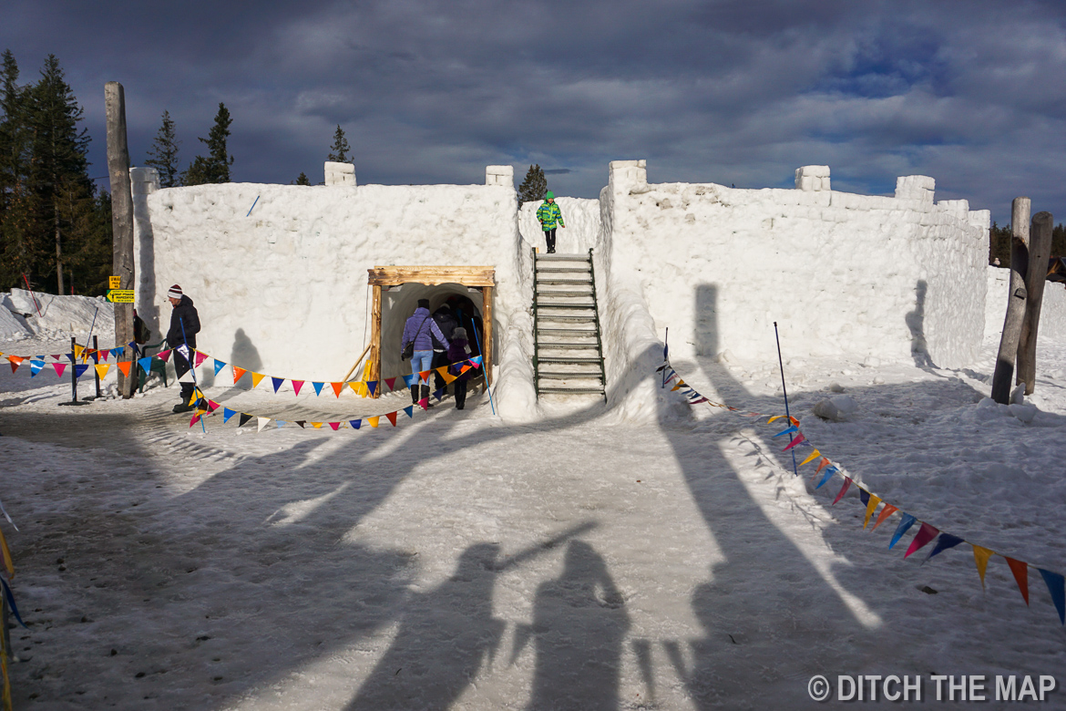 The next day we walked through the small ski town in the unseasonably warm weather. It’s been a while since we’ve enjoyed some sunshine. The town was bustling with weekend tourists. The main pedestrian street was lined with buildings with wooden exteriors. There were outdoor clothing stores and tons of restaurants. We walked through the town toward a giant ice maze we had heard learned of a few weeks earlier. We arrived at the maze at the base of a large ski jump. The maze was built a month earlier and by now was beginning to melt--some walls had melted down enabling us to see over them. Nonetheless, we still had a lot of fun navigating the maze and admiring its construction. It was built using blocks of ice stacked on top of each other.