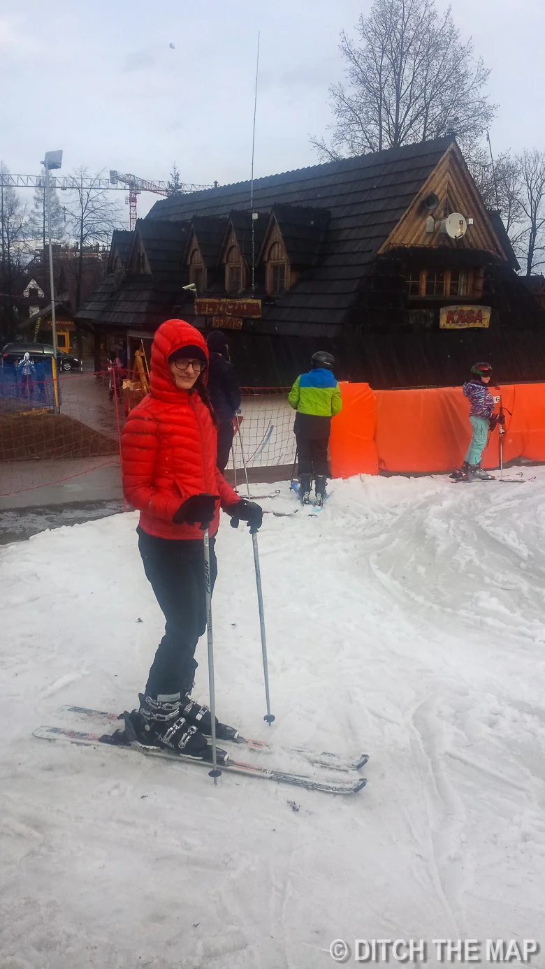 Sylvie skis for the first time at Nosal Ski Resort Zakopane, Poland