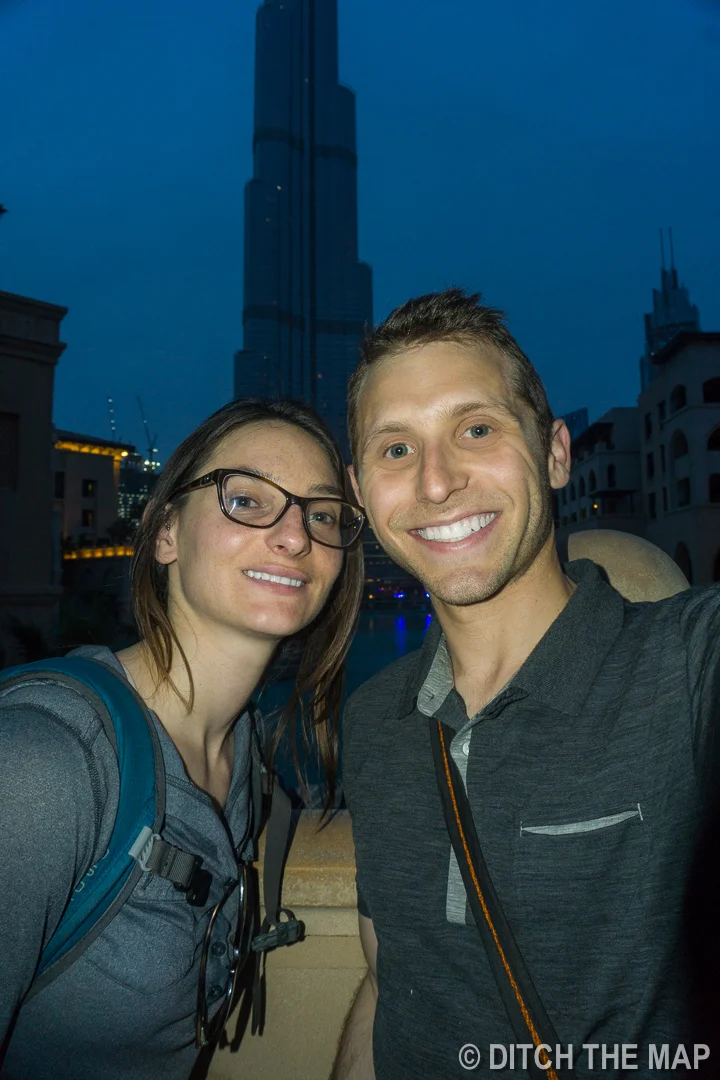In the Dubai Mall there was an indoor ice skating rink and an entire floor selling electronics. Scott had his fun playing around in the Sony Store and after we stopped for frozen yogurt. After depleting our tolerance for shopping, we headed outside to the see water show in the lake in front of the enormous Burj Khalifa. It was packed! People from all over speaking numerous languages crammed against the fence to see the three minute show. When the crowd dispersed we walked around the lake in what we thought was the direction of the Burj Khalifa- we had hoped to climb to the top for some panoramic views of the city. But, we were in a maze and stuck inside some kind of gated hotel community. With every turn we stumbled upon another beautiful and over priced hotel restaurant. These restaurants, associated with hotels, are the only ones allowed to sell alcohol- very over priced alcohol at that. We gave up on reaching the Burj Khalifa when we learned that tickets to the top were $35-$95.