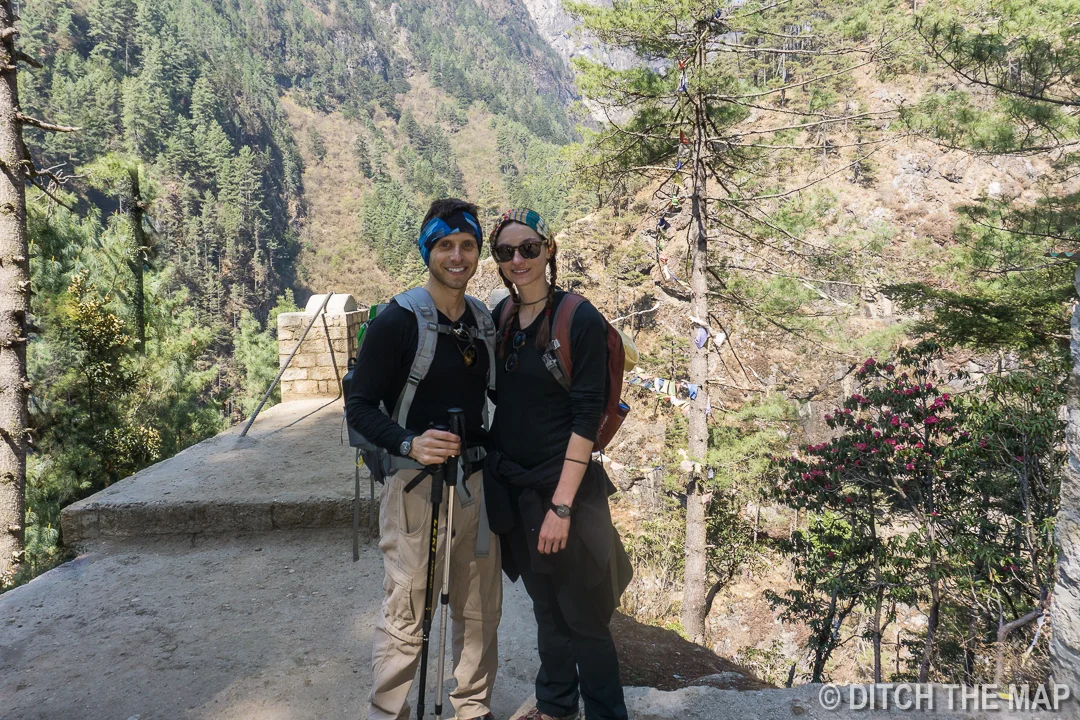 We trekked downhill past Chablung, along the Dudh Kosi Valley and then through the village of Ghat. Finally we arrived in Phakding. This is the typical stopping point for day 1, but Sylvie and I wanted to keep going. We had read a blog where the writer strongly urged to continue hiking onwards to Monjo if at all possible. We trekked onwards crossing a river on a long swaying bridge that took us to the town of Benkar. Later we crossed the Dudh Kosi to its east bank on yet another suspension bridge and climbed to Chumoa. After a short climb through a forest we arrived in Monjo.