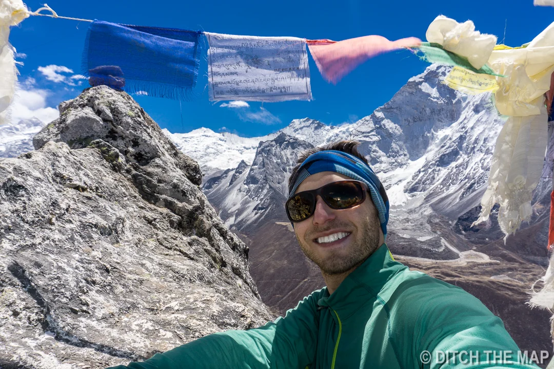 The last 15 minutes to the peak of Kala Patar involved scrambling over freshly snow-covered boulders, which added a level of difficulty. At the top my porter took a few photos of me and I took my first sips of water since heading out.