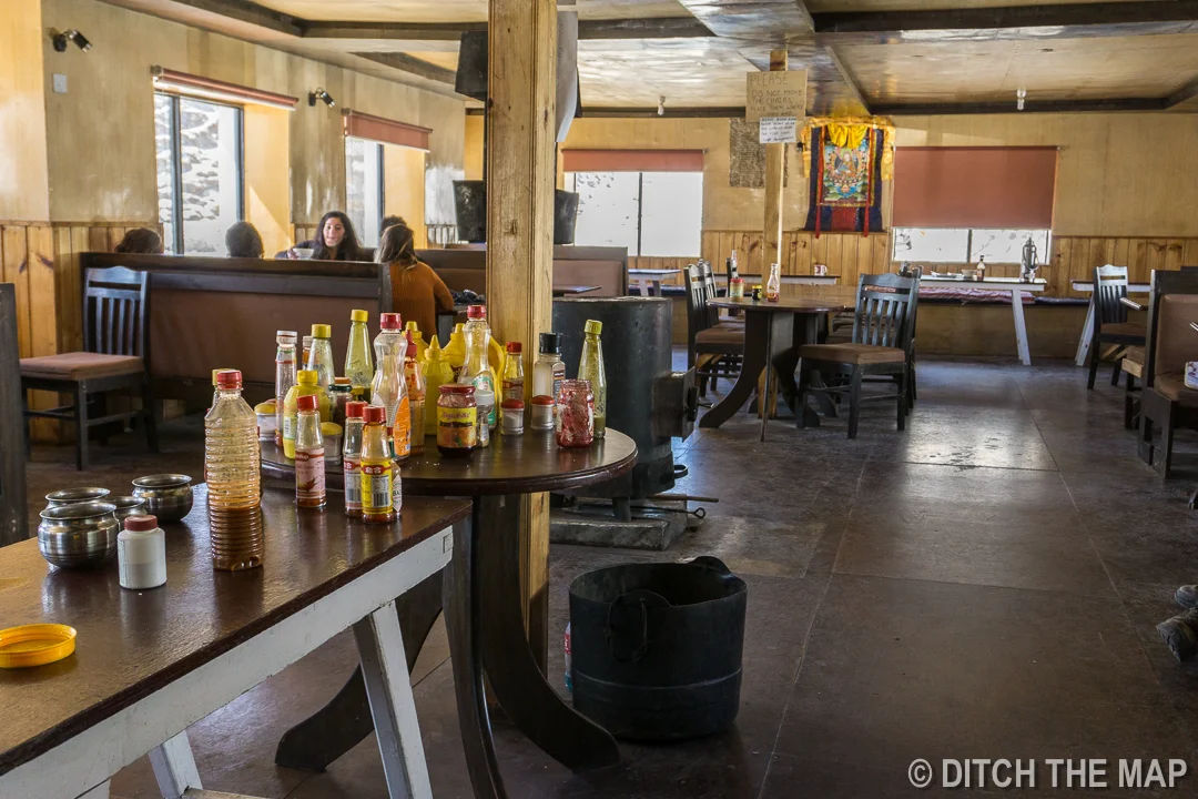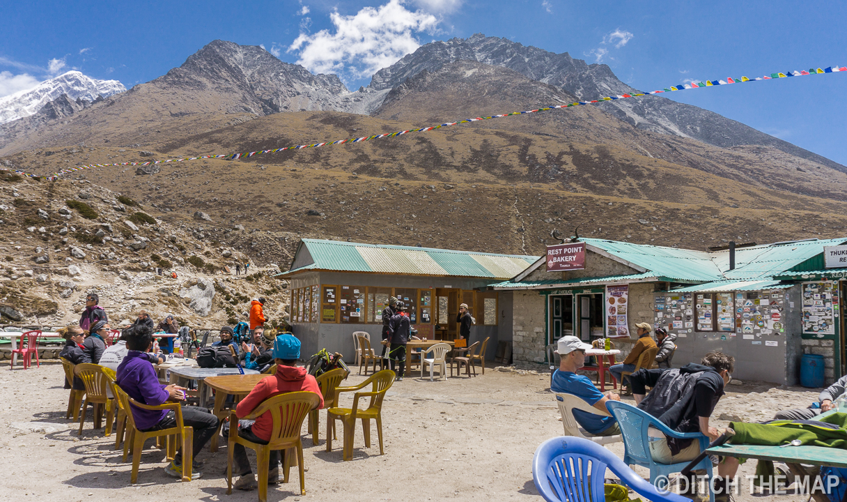 The town has 4 or 5 teahouses, all of which are nicer than the ones in Lobuche and seemingly the best stocked thus far (excluding Namche Bazaar). Compared to the last town (Lobuche) the prices have skyrocketed by another 25%. 2 hard-boiled eggs now cost 500rp ($5). One place accepted every type of credit card imaginable. However we are not staying at that particular teahouse. However this teahouse has a nice spread of condiments available for everybody’s use. They have jam, peanut butter, hazelnut spread, tobasco sauce, mustards, and Vegemite for the Aussies. Many of the condiments are very expired and the ones that aren't have been aged terribly by the extreme weather conditions. They were in the sweltering sunny heat during their week-long journey up the mountains. The same can be said about the candy bars. Still, a Snickers bar that has been sitting on a porters unbathed back for a week in the sun is still worth the $2.50 after a long day of hiking.