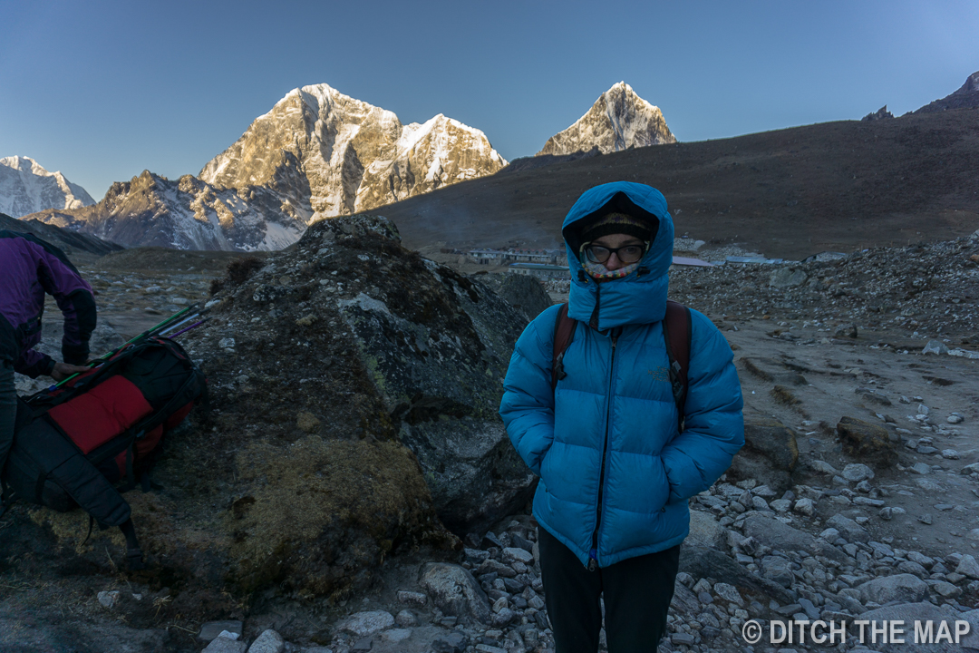 I dressed in three layers of socks, two pairs of gloves, a buff around my face, a hat, and 5 layers of shirts. My thick down jacket was zipped to my chin and I snapped my large hood on tightly. I was as ready as I was ever going to be to take on Kala Patar and met my porter to leave around 5:50am.