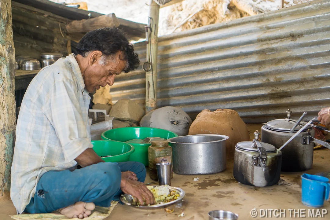 We stacked all our bags in one seat and squished between 3 other guys in the back row. The roads snaked along the mountainside barely holding onto the pavement (accidents are common place). After 90 minutes we had only moved 9 miles- traffic was terrible! We stopped at a local bus stop for what the driver declared a “tea break”. We drank some milk tea (chai masala) and on the way back to the bus Scott bought a slice of curry cucumber, roadside.