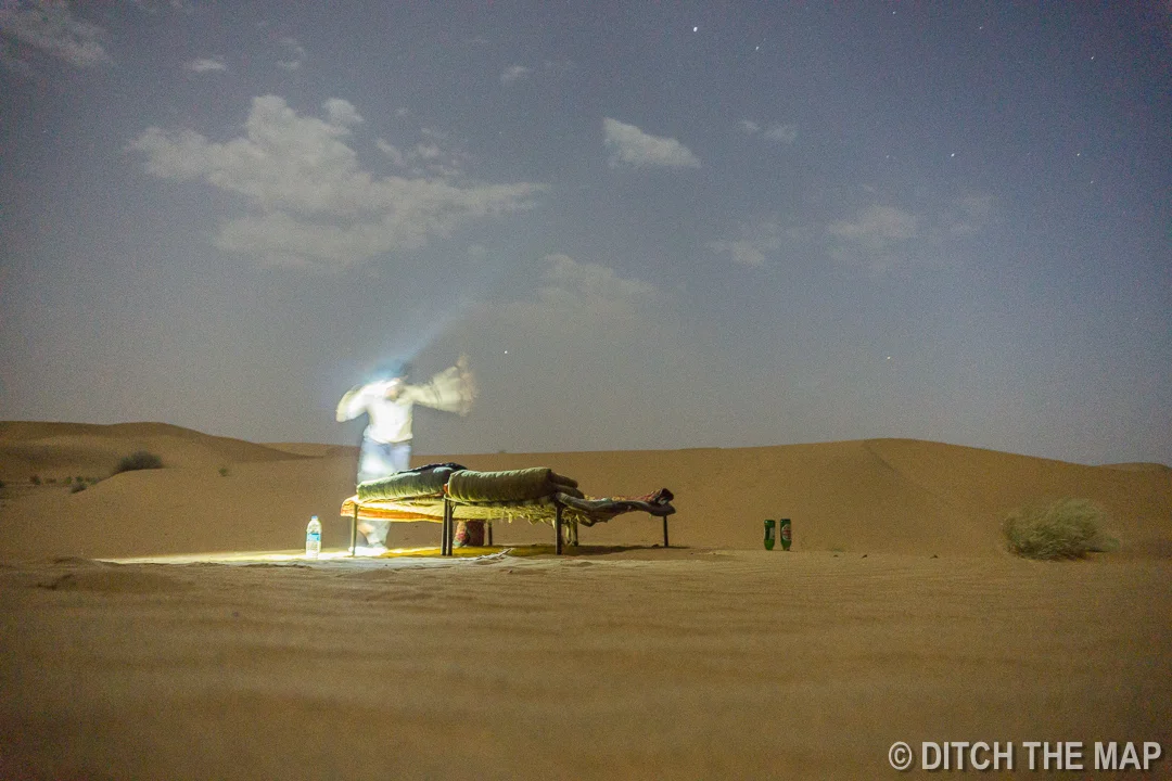 After dinner he showed us to our beds which seemed to have materialized out of nowhere. 2 cots sat on top of a sand dune- our accommodation for the evening. He told us that he would meet us in the morning. With that we were left on our own under the stars. The moon was shining so brightly that the view of the stars was obstructed. We decided to set out alarm for later in the night to see the stars in full power.
