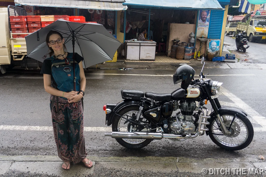 Sylvie by a parked motorcycle in Kochi, India