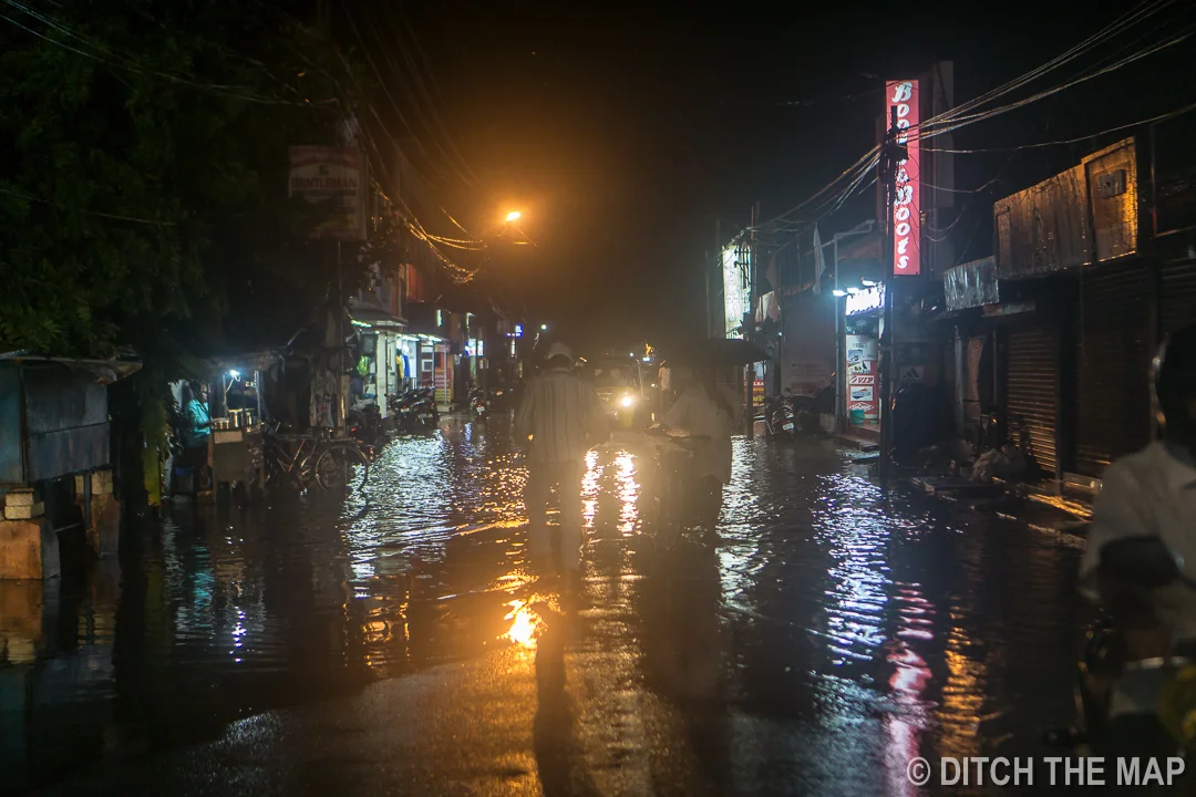 After dinner, while we were walking back to our guesthouse, we were caught in yet another torrential down pour. Rain was blowing in every direction and the sewers were overflowing within minutes. We had to take several detours. Entire streets were flooded with 6 inches of water. By the time we made it back to our room we were soaked.