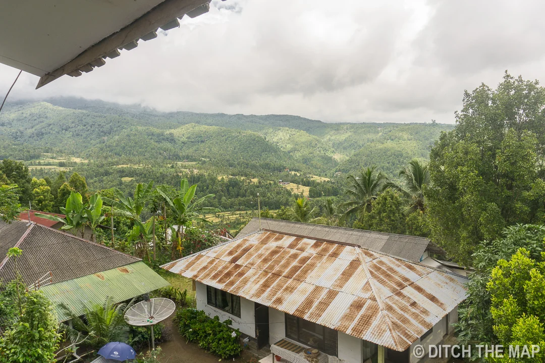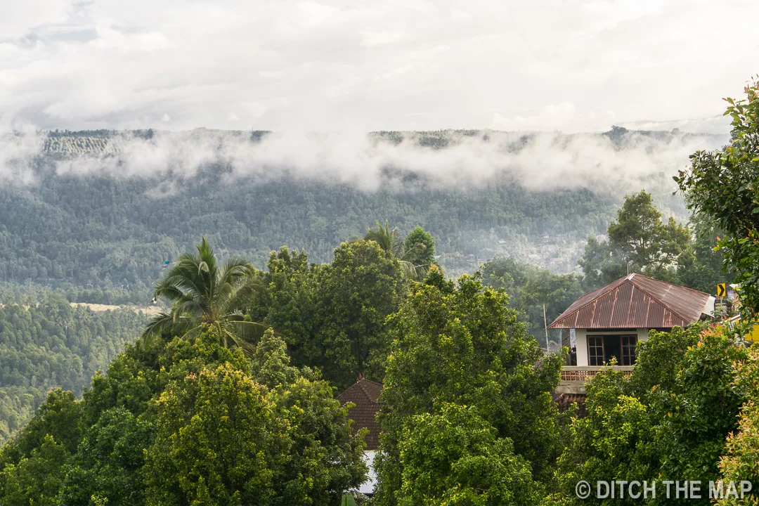 Shortly after checking into our home stay we headed out into the drizzling rain to hike to some waterfalls. Following a hand-drawn map given to us by our homestay we wandered off the main road onto a paved path. The path took us through through tropical brush past hillside villages, cocoa plants, papaya trees and coffee plants. The trail was like a maze through the forest. Unable to decipher our map we asked another couple on the trail for directions. They pulled out nothing other than another hand drawn map! Together we asked some locals to point us in the right direction. After about 45 minutes of walking we discovered the first waterfall. It was huge and beautiful and cast mist into the air everywhere. We followed over 400 stone steps up even higher to reach another, larger waterfall 20 minutes away. Our efforts were rewarded with another equally as beautiful waterfall.