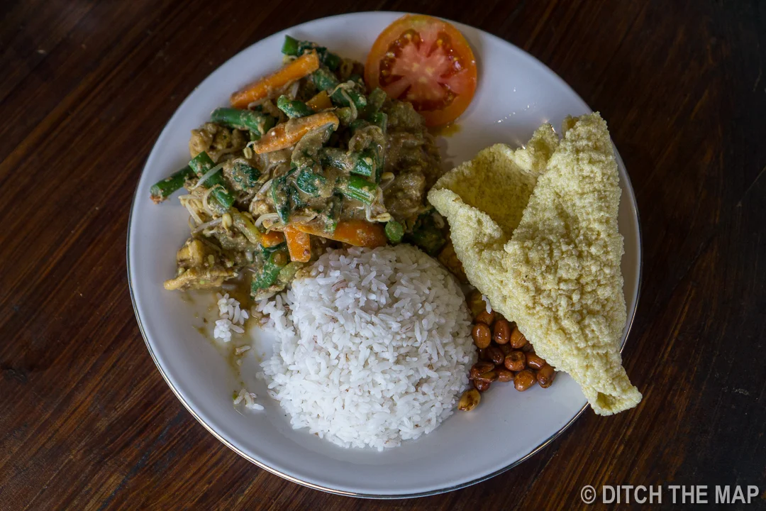 On our walk back from the waterfall hike we stopped at the restaurant, Eco Cafe 2, for a coffee break. This second floor restaurant showcased incredible views of the surrounding hazy mountains and rice fields. We had the whole place to ourselves and the traditional music playing in the background really completed the whole experience. We ordered two types of civet coffee- robusta and arabica. The coffee was served in a fancy contraption. We ordered some traditional Indonesian food to accompany our coffee. We enjoyed: