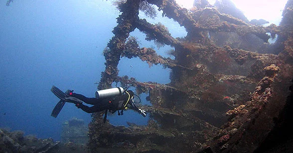 A SCUBA Diver in the Liberty Wreck outside Tulamben, Bali