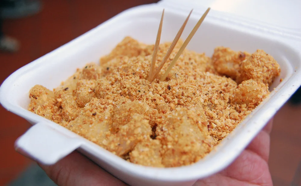 Muah Chee: glutinous rice rolled into little tatter tot shapes covered in peanut crumbs and sugar. Watching it being made is an intriguing process. The dough is so stretchy and elastic that it springs around when being rolled at cut. This springy dough contributes to a chewy but delightful texture. It's just sweet and crunchy enough and makes an excellent snack.