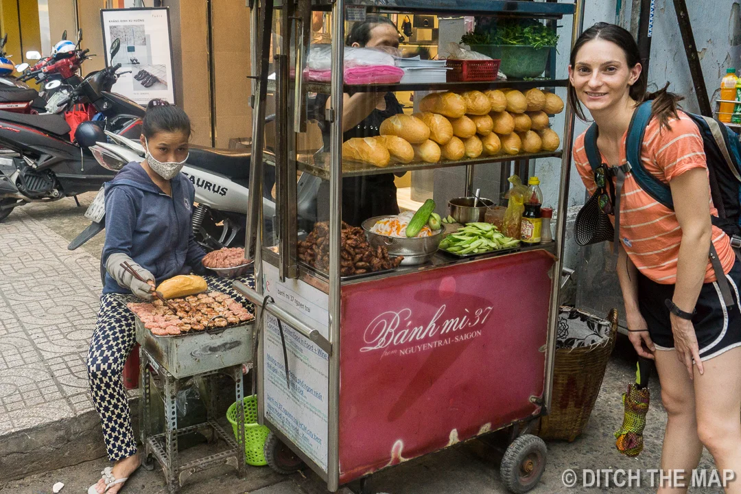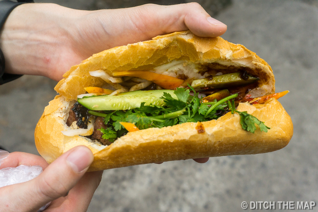 We had great difficulty trying to find local food and cheap street eats in Ho Chi Minh City. Though we managed to track some local delights down and have added Bahn Mi and Bo La Lot to our culinary cache. After being deprived of good bread for too long Banh Mi was a welcomed treat. The French staple, the baguette gets a Vietnamese twist when prepared with homemade mayonnaise/butter, sliced chili pepper, cilantro leaves, cucumber, a tangy-sweet daikon and carrot pickle, a drizzle of soy sauce and a variety of meats like, liver pâté, cold cuts, roasted chicken, grilled pork. We found a tiny cart grilling up pork sliders for their Bahn Mi and ordered one. Perfection.