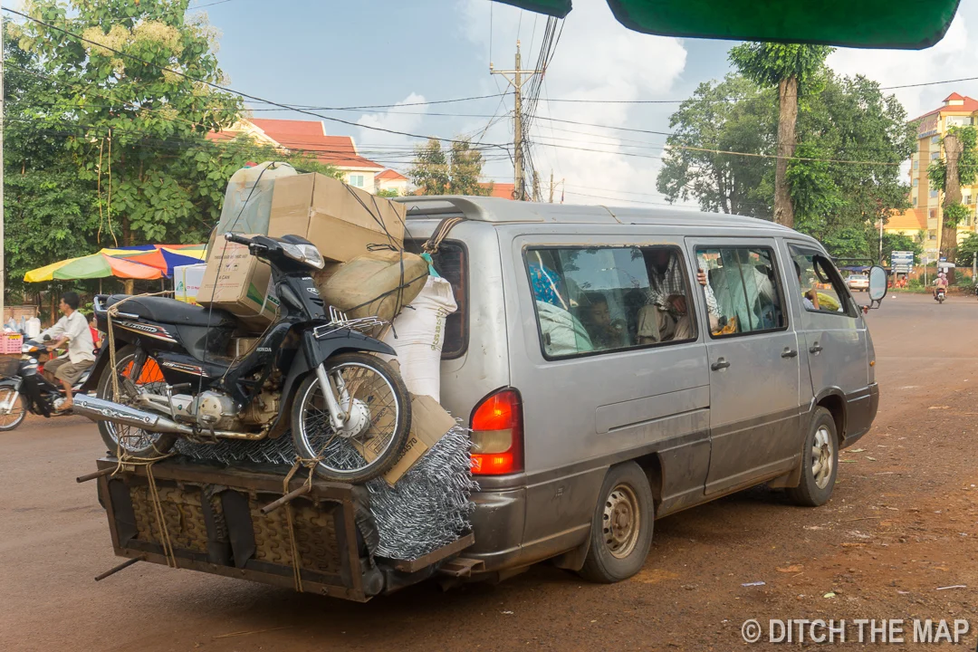 After comparing options and prices at several agencies we booked a direct bus from Siem Reap to Mondulkiri. We are told to wait outside of our hotel at 6:45am but we didn’t get picked up until 7:30. Though we paid (over-paid even despite negotiating) for a direct bus a small hellish minivan was greeted us. Sylvie and I were not happy, we instantly knew the 6-hour drive we were promised would be more of an all-day ride. We tried to communicate our frustrations to the driver but unfortunately he and almost everyone else already on the van spoke no English. There were only two seats left. One seat crammed next to the driver and the last available seat was a folding chair with a tiny backrest. Ugh.