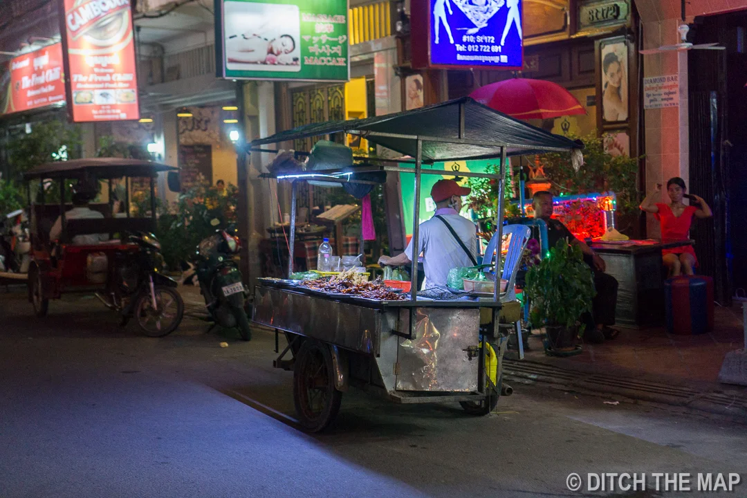 We spent our first evening walking along the waterfront with a pass by the Royal Palace. The area was brightly lit and filled with locals sitting on the grass, hanging out with family and being tourists in their own city. Strolling around we found ourselves in the red light district with bars advertising "sexy dance shows" and heavily made up girls waiting in packs outside of seedy bars. The city itself was a a bit run down and dirty with litter strewn throughout the streets. It was refreshing to see however that the 'touristy' area of the city still maintained local character with street side restaurants and markets dominating the scene. We checked out the night market where Scott tried chicken feet and on one our of days in the city we stopped by the Russian market.