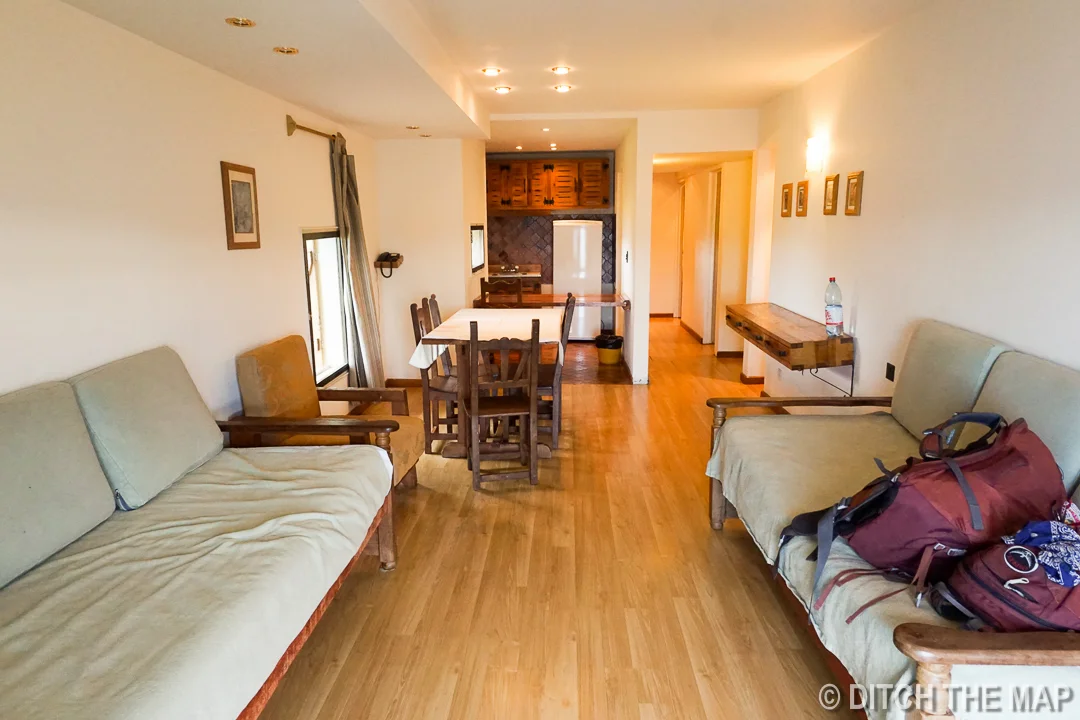 We arrived to our hostel after walking over 2 miles with our heavy backpacks. Our backs drenched with sweat, we were excited to finally get to rest for a bit. Unfortunately, our hostel was experiencing water problems and could not accommodate us. Fortunately, they had another property, outside of town, which had space for us. We weighed our options…any last minute booking in this town would be very expensive. We really wanted to stay in town but the woman at the front desk promised us that buses come every 20 minutes and there was a stop right in front of the other hotel. We opted to take the other room. They called a cab for us and paid for the charge. The other hotel was going to honor our initial reservation and not charge us the actual amount of the new room we were given. This new place was amazing—2 bedrooms, 2 full bathrooms, a kitchen, living/dining areas, 2 full couches, and amazing views of the lake and mountains!