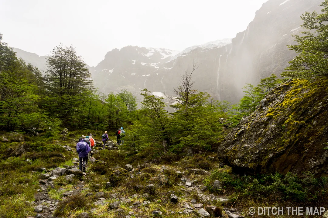 Walking the last stretch of our hike through windy conditions to Alerce Glacier outside Bariloche, Argentina