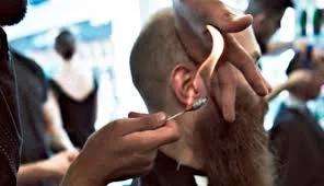 The diamond-grading barber made another pass as he surgically extracted blackheads, pimples, and ingrown hairs. He even went as far as showing me one of the specimens while a smile stretched across his face in satisfaction. Next he dipped a cotton swab into a container of Barbicide and lit it on fire. He moved the blazing the swab close to my face and I instinctively tensed up—Sylvie sat comfortably in her chair amused. He moved the flaming torch close to my face while cupping his other hand. He seemingly trapped the hot air and then whipping it onto my face effectively singeing off all the peach-fuzz on my ears, forehead, and cheeks. Although receiving no burns it was f***ing hot.