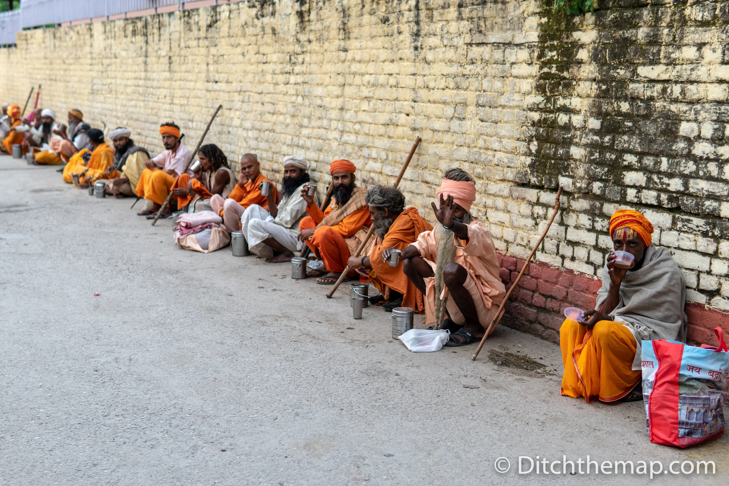 Although the landscape photo is great for a yoga school’s website since it inspires spiritual scenery I feel it is the job of a travel photographer to depict the true environment of a location and have the viewer ‘learn’ their own insights. Take for example the photo below. The photo shows Indian men sitting in a row during the early morning and accepting offerings from a local temple. It takes you on location and you feel like you are there.