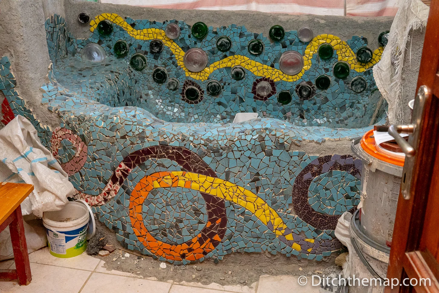 During our time on the farm we revamped our perception of what trash is. We considered not only the primary use of something but its usefulness after its initial consumption. Things that we could not find a sustainable use for were not purchased and taken back to the farm. Shopping at local markets allowed us to rid our shopping bags of unnecessary plastic packaging. We created a beautiful mosaic in the bathroom using broken tiles that we salvaged from a construction site. We turned Sylvie’s broken straw hat into a small dish to hold teabags. We tied the tomato plants and gourd vines using strands of hemp and twine. We built a shelving system using an old door along with some wood from a broken piece of furniture. I learned that a consumerist’s trash can be repurposed in a multitude of ways—a task that really gets the creative juices flowing.